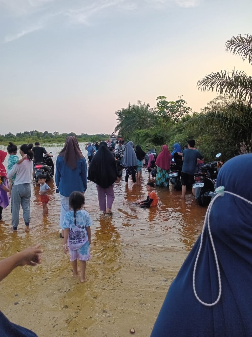 Mereka yang datang bukan saja terdiri dari kalangan orang dewasa, tapi juga anak-anak. Ada yang menggunakan sepeda motor dan juga mobil untuk sampai ke lokasi wisata banjir tersebut.