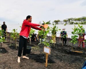 Penanaman pohon bakau untuk mencegah abrasi pada bibir pantai ini dilakukan Presiden bersama Gubernur Riau, Syamsuar, Bupati Bengkalis, Kasmarni, serta tokoh masyarakat dan tokoh adat Pulau Bengkalis.