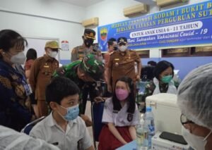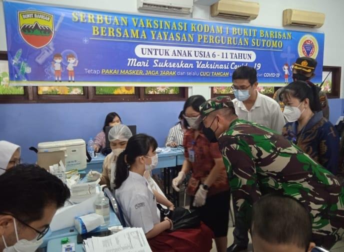 Medan – Dalam rangka upaya memutuskan mata rantai penyebaran Covid-19 dan memperkuat Herd Immunity di Provinsi Sumatera Utara (Sumut) terutama di Kota Medan, Komando Daerah Militer I Bukit Barisan kembali melaksanakan Serbuan Vaksinasi TNI Buat murid SD dengan bekerjasama dengan Pihak Yayasan Perguruan Sutomo 1 Medan. Vaksinasi kali ini diikuti para murid SD yang berusia 6-11 thn, jenis vaksin Sinovac, dilaksanakan selama 4 hari dengan target 4.000 murid.