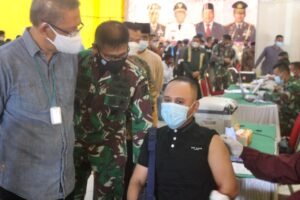 Pontianak – Panglima Kodam XII/Tanjungpura, Mayjen TNI Muhammad Nur Rahmad bersama Gubernur Provinsi Kalimantan Barat, H. Sutarmidji, S.H., M.Hum dan Kapolda Kalbar, Irjen Pol R. Sigid Tri Hardjanto meninjau pelaksanaan vaksinasi Covid-19 yang digelar oleh Perkumpulan Merah Putih di Rumah Adat Melayu, Pontianak. Sabtu 07/08/2021.