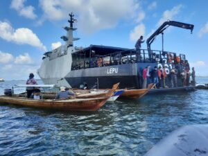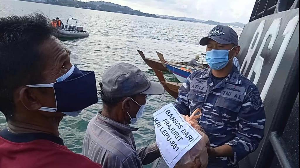 Lantamal IV (Batam) – Dimasa pandemi Covid-19 dan dalam rangka Peringatan HUT ke-76 RI, KRI Lepu-861 yang merupakan unsur jajaran Satrol Lantamal IV Tanjung pinang dibawah kendali taktis Komandan Gugus Keamanan Laut Komando Armada I (Danguskamla Koarmada I), Laksamana Pertama TNI Haris Bima Bayuseto, S.E., M.Si., pada Operasi Pamtas Indonesia-Singapura 2021, melaksanakan Serbuan Bansos dengan memberikan bantuan berupa paket sembako kepada nelayan yang dijumpai di laut di daerah operasi, Minggu siang (08/8/2021).
