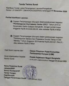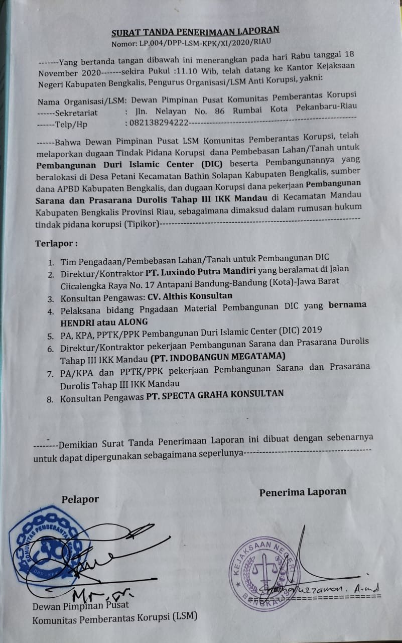Kepada wartawan di Kejaksaan Negeri Bengkalis, Mukhtaruddin mengatakan, sejak dua kasus dugaan korupsi (Tipikor) yang telah dilaporkan pada 17 November 2020, pihaknya belum menerima informasi lebih lanjut terkait dugaan korupsi dana rumah ibadah dan infrastruktur tersebut.