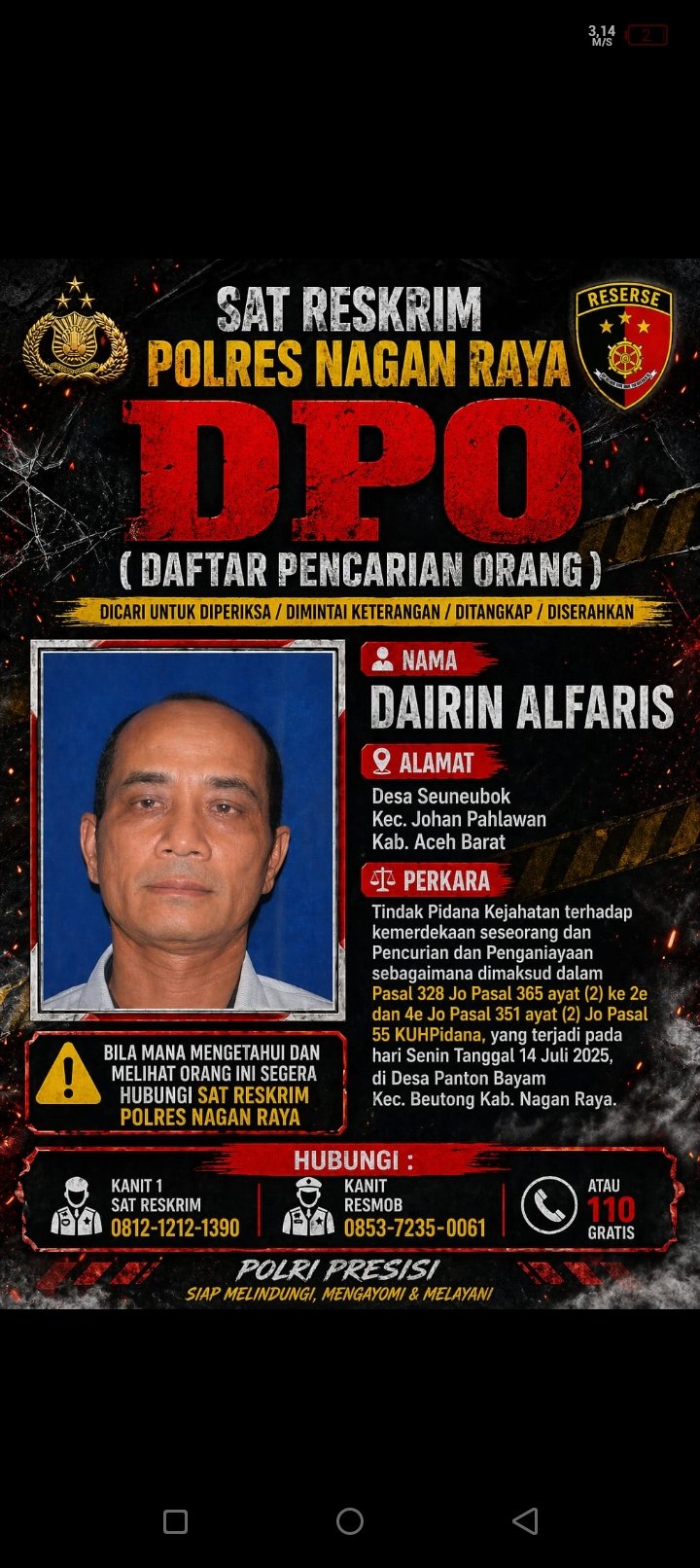 NAGAN RAYA, (CNK) — Satuan Reserse Kriminal (Sat Reskrim) Polres Nagan Raya kembali mengeluarkan Daftar Pencarian Orang (DPO) terhadap seorang pria yang diduga terlibat dalam tindak pidana kejahatan terhadap kemerdekaan seseorang serta kasus pencurian dan penganiayaan.
