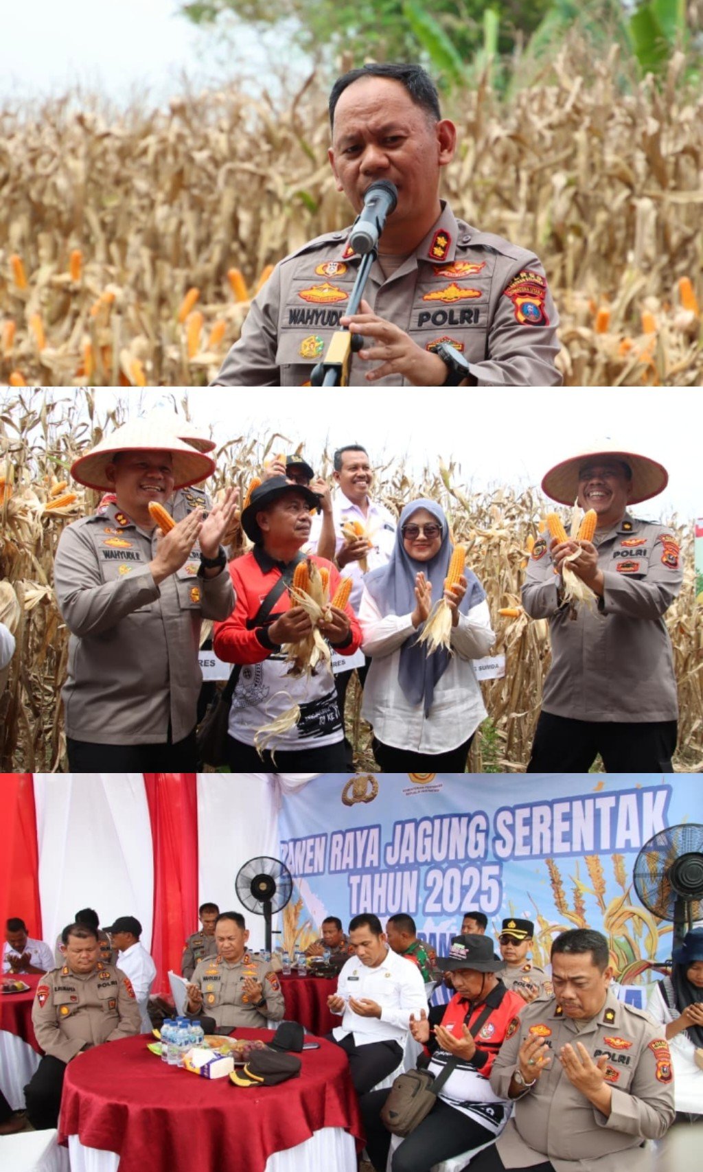 Kegiatan panen raya berlangsung dengan lancar dan diakhiri dengan sesi foto bersama serta peninjauan langsung hasil panen jagung oleh Kapolres dan tamu undangan.