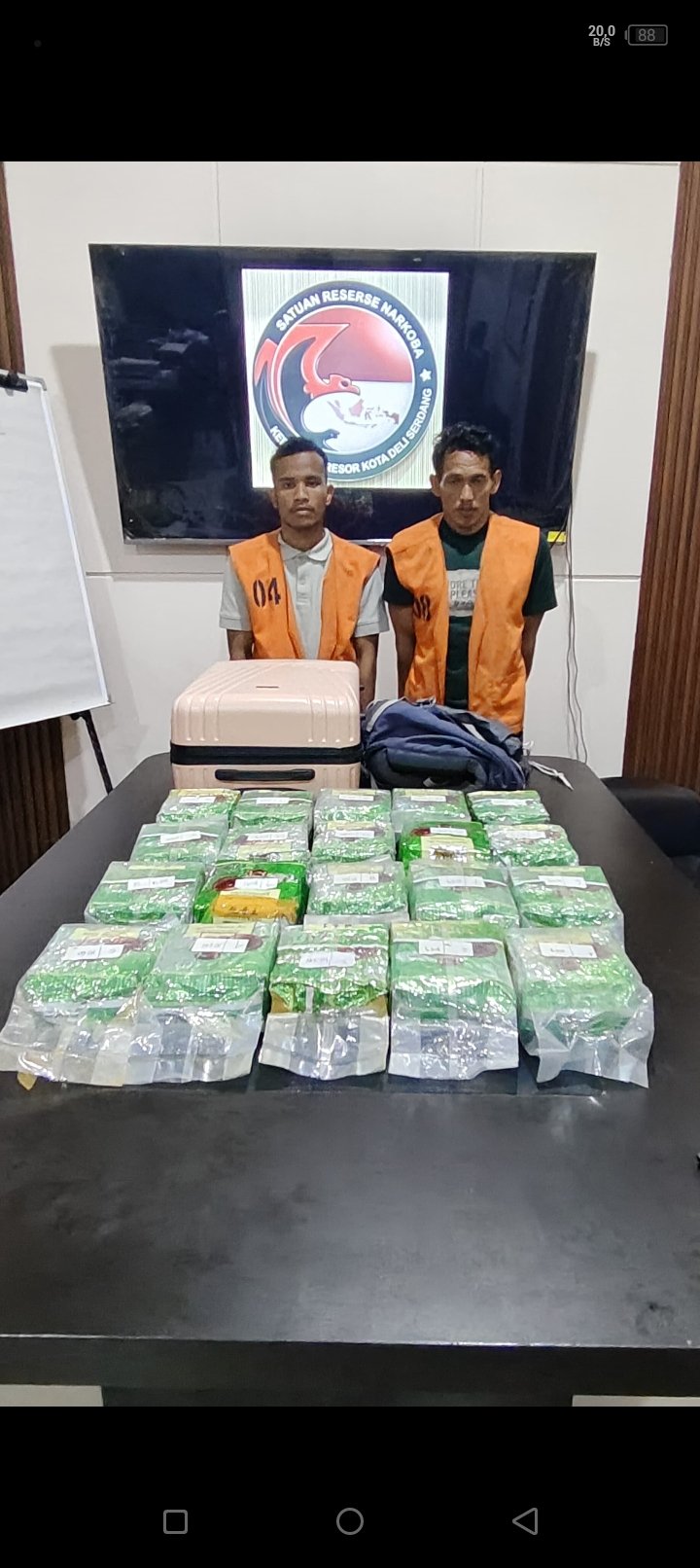 Dari hasil penggeledahan, petugas menemukan 20 bungkus plastik teh Cina berwarna hijau yang diduga berisi sabu. Sepuluh bungkus ditemukan di dalam tas gunung berwarna biru dan sepuluh bungkus lainnya di dalam koper pakaian berwarna pink. Total berat bruto keseluruhan mencapai ±21.142 gram. Selain itu, turut diamankan dua unit telepon genggam Android yang diduga digunakan untuk komunikasi dalam transaksi.