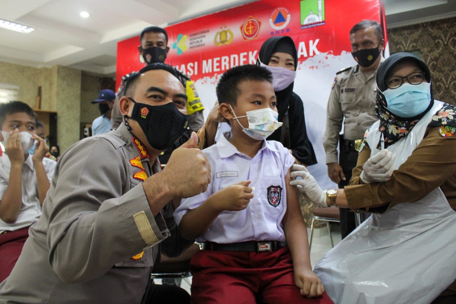 “Kita sudah masuk ditahap berikutnya untuk memvaksin anak-anak diusia 6 sampai 11 tahun, Alhamdulillah hari ini di wilayah Kota Pekanbaru melaksanakan kegiatan Vaksin total sebanyak 1.000 orang yang dibagi tiga tempat di Polresta sendiri sebanyak 500 orang, di SD Santai Maria ada 100 dan di SD Witama sebanyak 400,” Ujar Kapolresta Pekanbaru.