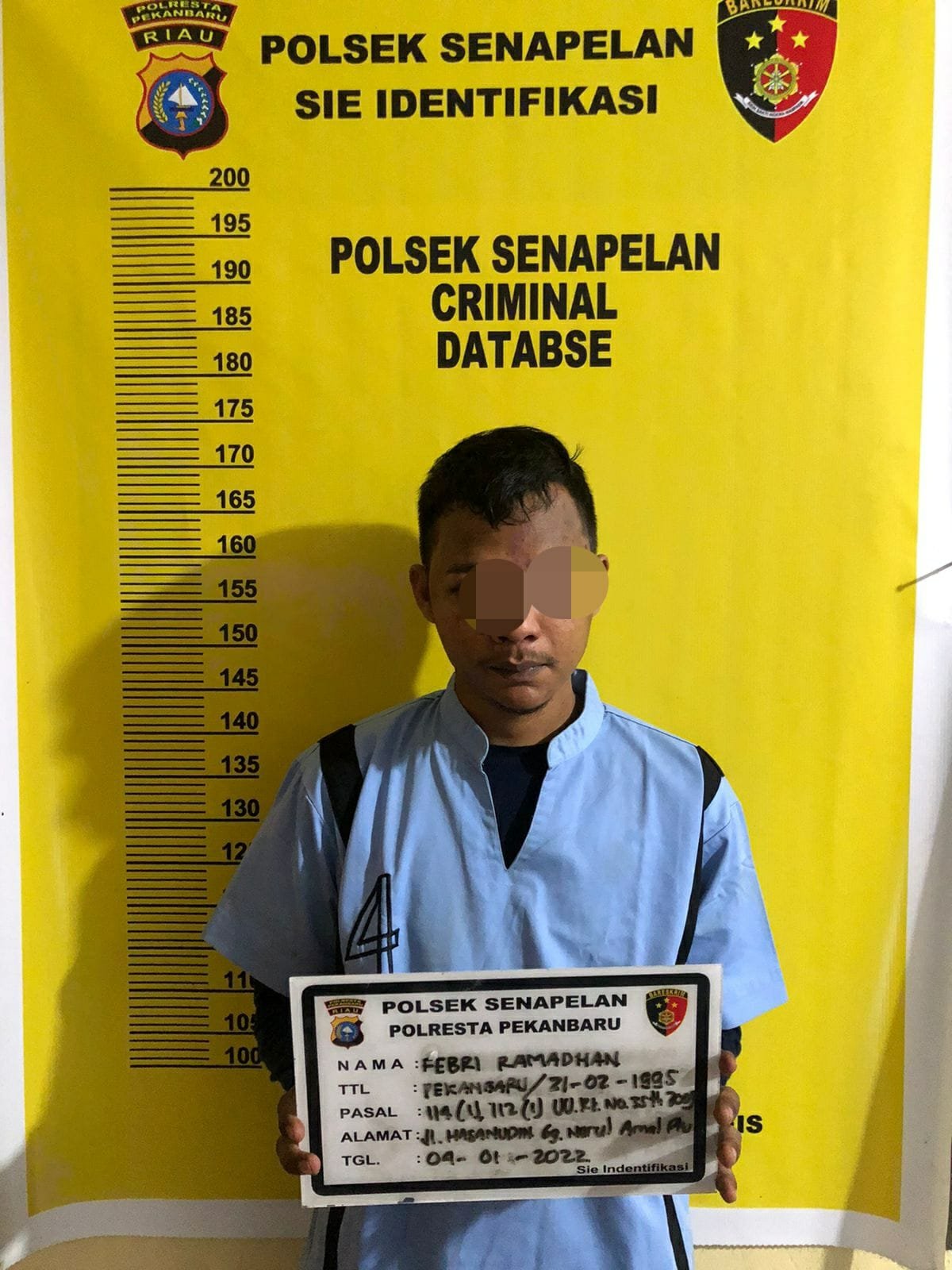 Dari hasil penyelidikan Senin, 04 Januari 2022 Tim Opsnal Polsek Senapelan berhasil mengamankan tersangka inisial FR (26) di Jln. Hasanudin Gg. Amaliyah Kelurahan Rintis, Kecamatan Lima Puluh, Kota Pekanbaru pada pukul 14:00 WIB.