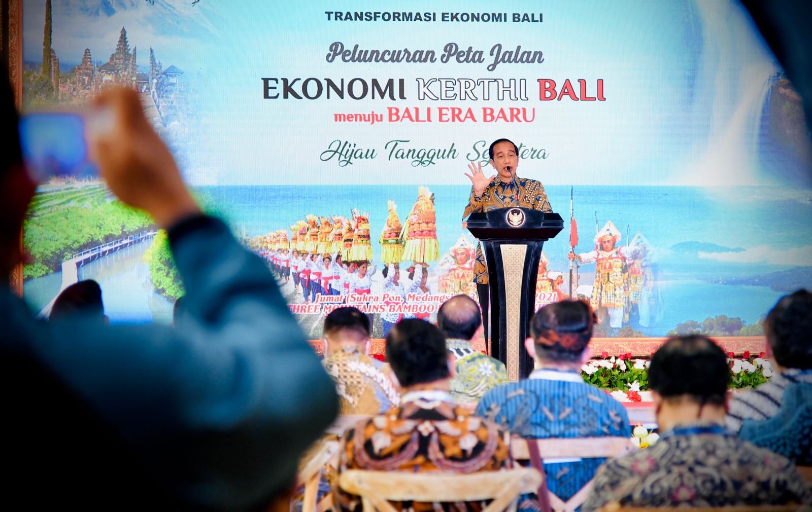 CAHAYANEWSKEPRI.COM – Hal tersebut disampaikan oleh Presiden Joko Widodo saat memberikan sambutan pada Peluncuran Peta Jalan Ekonomi Kerthi Bali, yang diselenggarakan di Three Mountain Bamboo Pavilion, Kura-Kura Bali, Kota Denpasar, Provinsi Bali, pada Jumat, 3 Desember 2021.