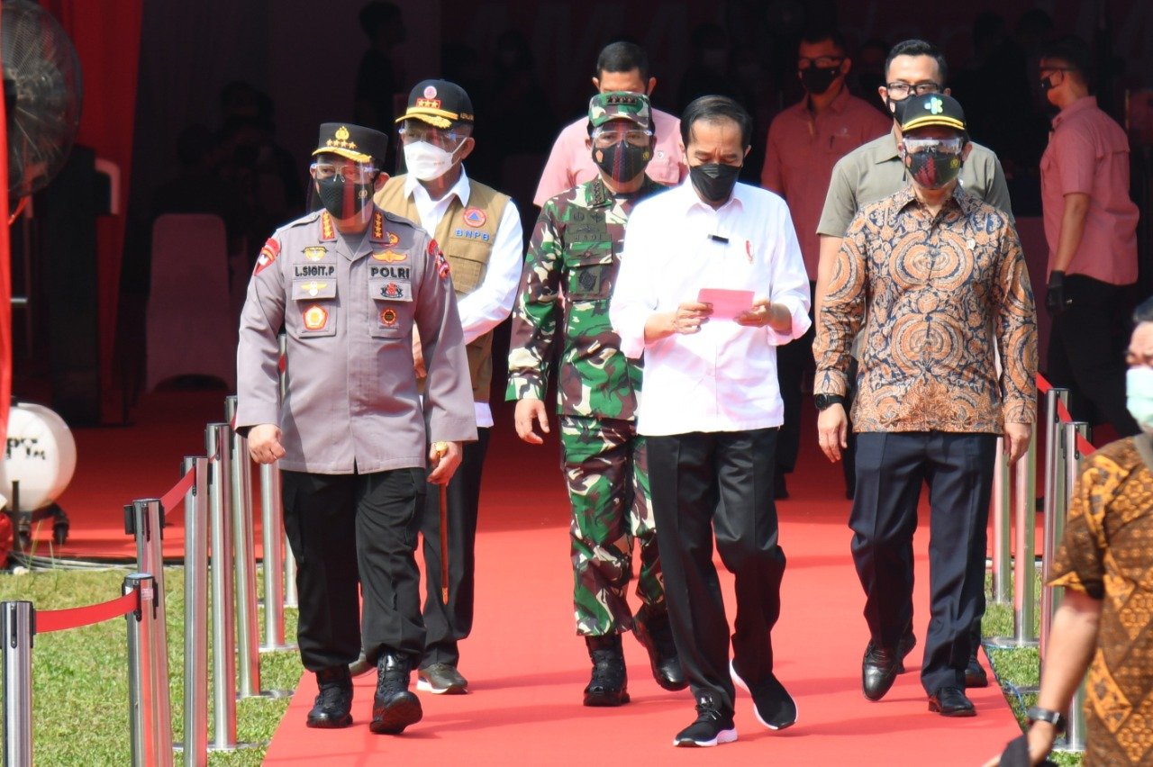 CAHAYANEWSKEPRI.COM – Presiden didampingi oleh Kapolri Jenderal Listyo Sigit Prabowo, Panglima TNI Marsekal Hadi Tjahjanto, Menteri Kesehatan Budi Gunadi Sadikin dan Kepala BNPB Letjen Ganip Warsito.