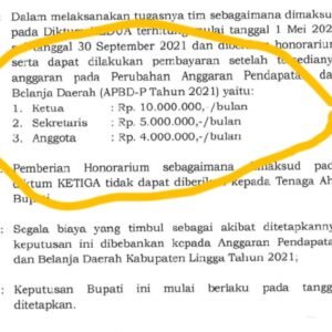 Lingga, Kepri – Dipertanyakan sumber dana anggaran ratusan juta rupiah guna pembayaran honorarium 10 orang Tim Evaluasi Perijinan dan Investasi (TEPI) yang dibentuk dan terlampir dalam SK tertanda tangan oleh Bupati Lingga. Ini tanggapan Bupati dan Sekda Kabupaten Lingga, Kepri. Selasa 01/06/2021.