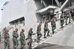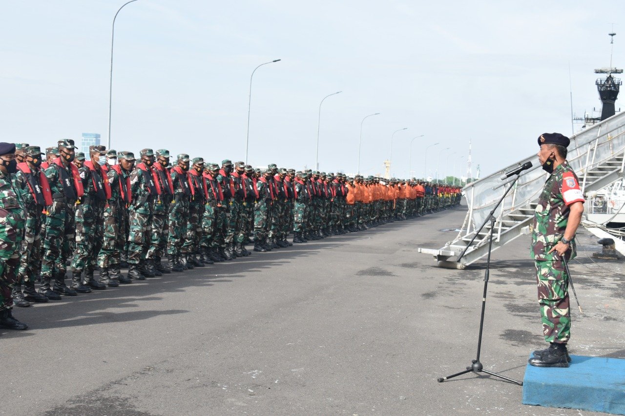 Surabaya – Ratusan Siswa Komando Pembinaan Doktrin, Pendidikan dan Latihan TNI AL (Kodiklatal) laksanakan latihan praktek (Lattek) Wira Jala Yudha menggunakan KRI dr. Soeharso-990 berangkat dari dermaga Semampir, Ujung, Surabaya, Sabtu (8/1/2022).
