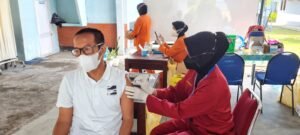 Tim nakes melayani secara bergantian satu persatu warga yang sudah mengantri sejak pagi untuk mendapatkan giliran vaksin.