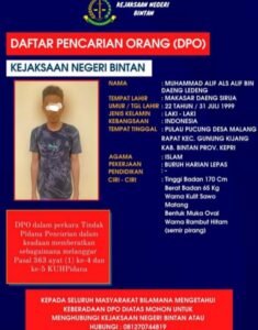 CAHAYANEWSKEPRI.COM – Bermula dari terbitnya DPO oleh Kejaksaan Negeri Bintan atas nama Muhammad Alif Als Alif Bin Daeng Ledeng, laki-laki (22 tahun) atas perkara Tindak Pidana Pencurian dengan Pemberatan yang mana terbitnya DPO ini telah disampaikan dan diketahui oleh Polres Tanjung pinang hingga ke tingkat Polsek dan Kecamatan, Kelurahan se-Kota Tanjung pinang, sehingga juga diketahui oleh warga masyarakat.