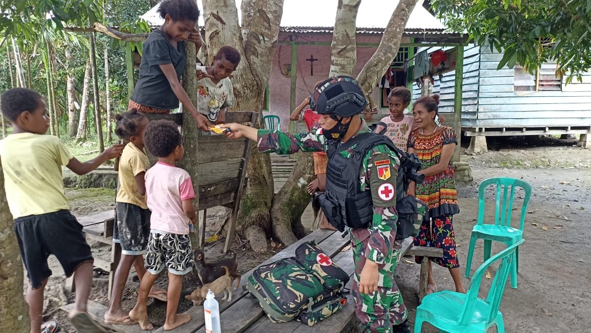 Keerom – Pos Ampas Satgas Pamtas RI-PNG Yonif 711/Rks melaksanakan silahturahmi ke rumah-rumah warga binaan sekaligus memberikan pelayanan kesehatan gratis di Desa Ampas, Distrik Waris, Kabupaten Keerom, Jayapura Minggu (23/01/2022).