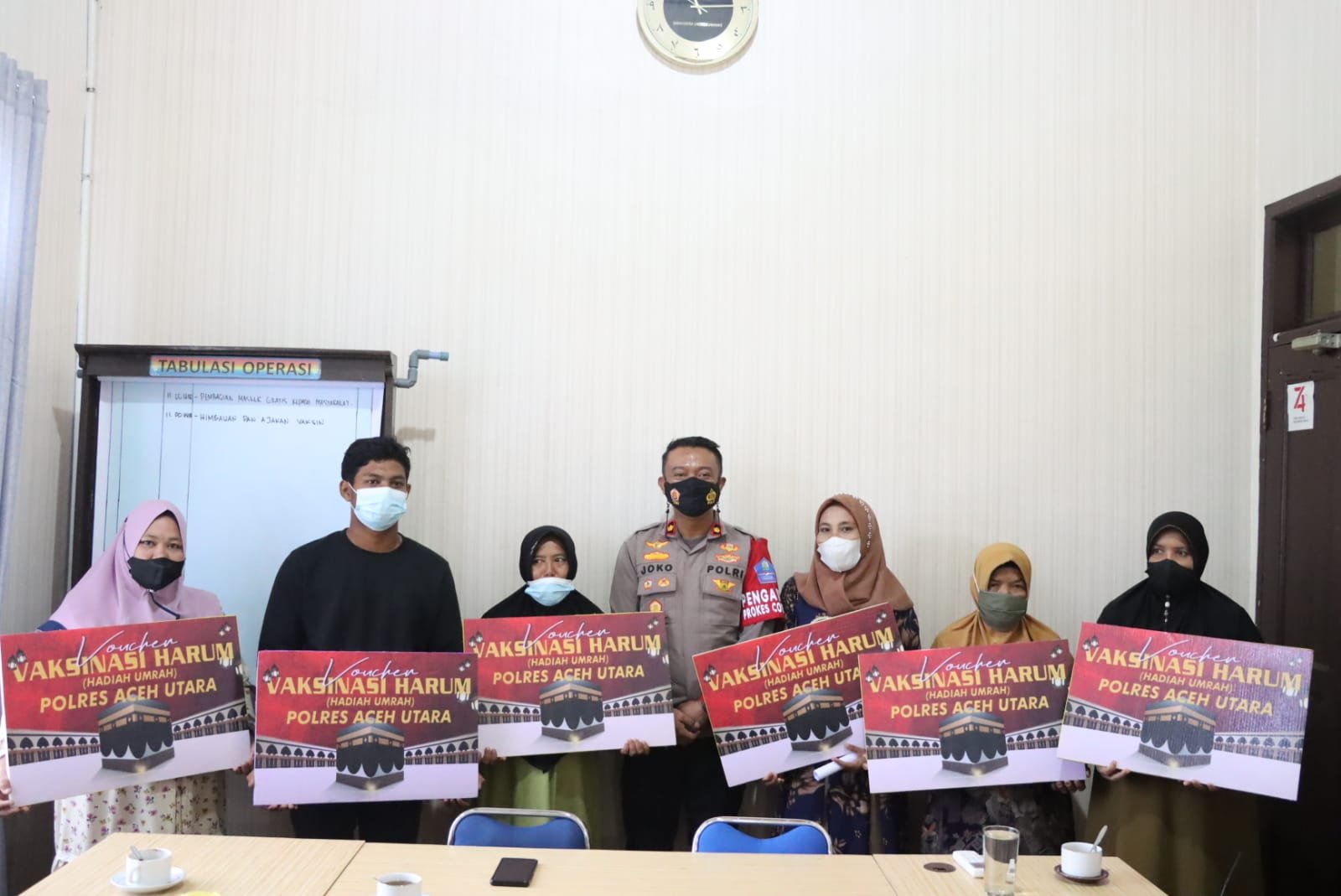 “Kapolres Aceh Utara AKBP Riza Faisal, S.I.K., M.M., Melalui Kasi Humas Polres Aceh Utara AKP Sudiya Karya Menyampaikan Bahwa 6 Orang Masyarakat Yang Telah Memenangkan Undian Vaksinasi Harum (Hadiah Umrah) Untuk Dapat Hadir di Mapolres Aceh Utara Pada Hari ini, Jumat Tanggal 4 Februari 2022 Untuk Diberikan Secara Langsung Voucher Vaksinasi Harum Secara Simbolis,” Ujar Kasi Humas.
