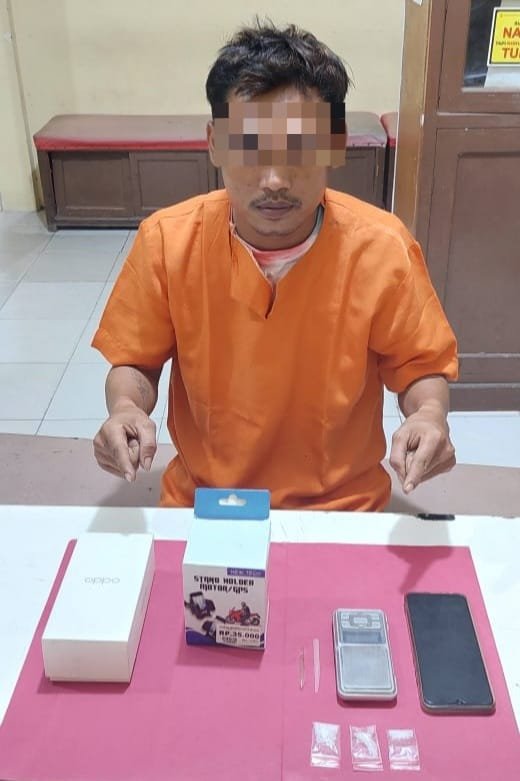 Tapung Hilir – Tim Opsnal Polsek Tapung Hilir menangkap seorang tersangka yang diduga sebagai pengedar Narkoba dan berhasil mengamankan Barang Bukti narkotika yang diduga shabu seberat 2,68 gram di Jalan Simpang Obor, Dusun Kota Batak, Desa Pantai Cermin, Kecamatan Tapung, Kamis (17/11/2022) sekira pukul 22.00 WIB.