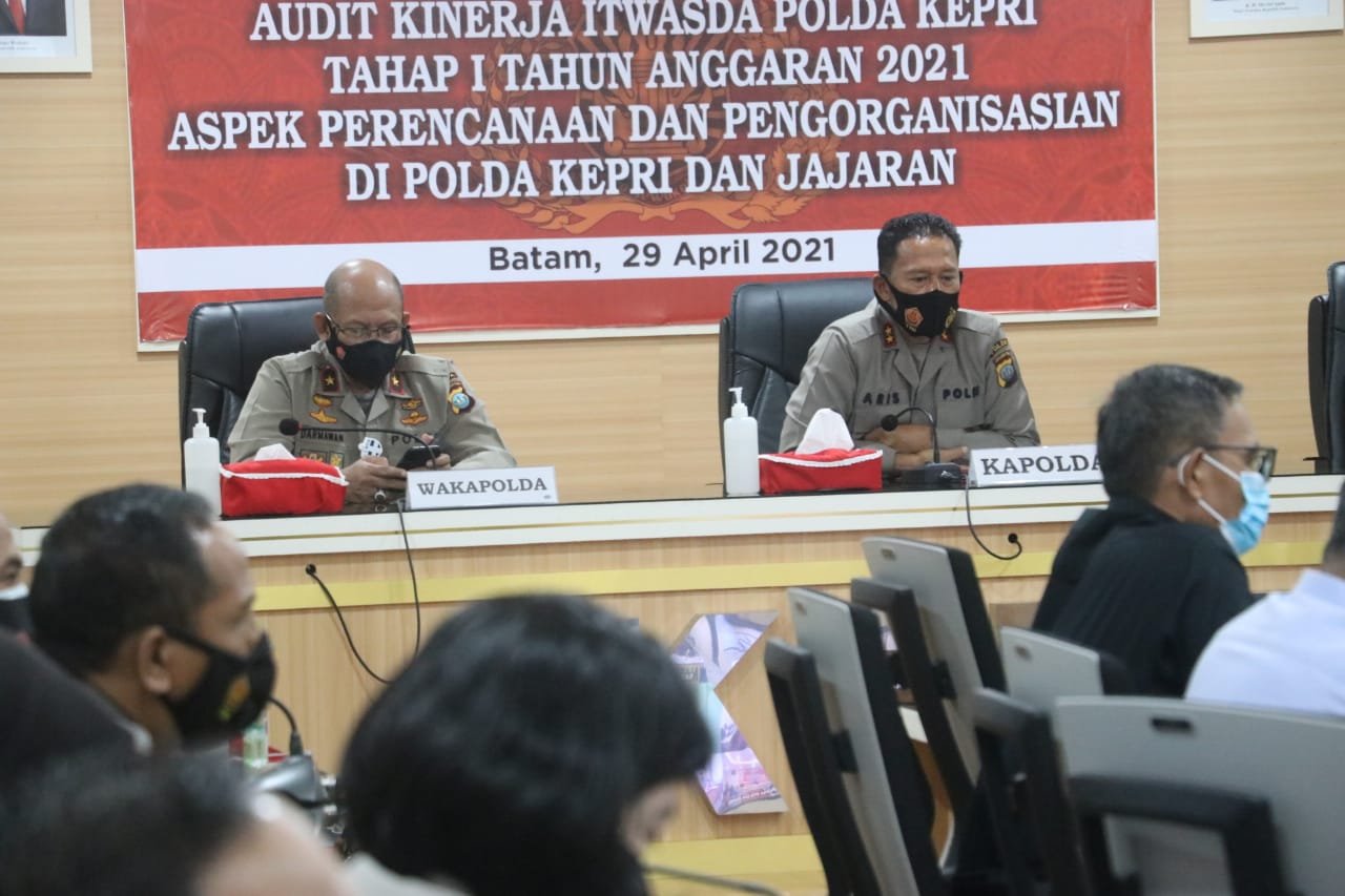 Batam, Kepri – Kapolda Kepri Irjen Pol Dr. Aris Budiman M.Si pimpin Taklimat Akhir Audit kinerja dilingkungan Polda Kepri dan jajaran, bertempat di Rupatama Polda Kepri pada Kamis, (29/4/2021).