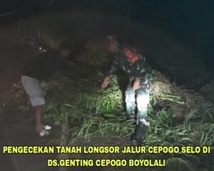 CAHAYANEWSKEPRI.COM – Setelah mendapat laporan dari warga setempat, Babinsa Koramil 06/Cepogo Kodim 0724/Boyolali Sertu Mansur langsung mendatangi tempat kejadian tanah longsor dan langsung melakukan koordinasi dengan aparat terkait, rencananya pagi ini akan ada kerja bakti pembersihan materiil yang diakibatkan longsor tersebut.