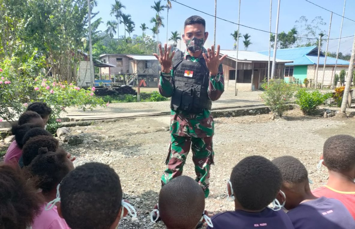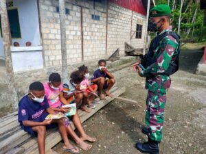 Keerom – TNI melalui Satgas Pamtas RI-PNG Yonif Mekanis 512/QY dari pos Waris yang berada diperbatasan di Kampung Banda, Distrik Waris, Kabupaten Keerom, Papua. Selasa (16/11/2021) menyambangi desa binaan, dalam kegiatan tersebut anggota pos Waris memberikan penjelasan tentang wawasan kebangsaan dan Kegiatan dilakukan dengan menfaatkan alam terbuka.