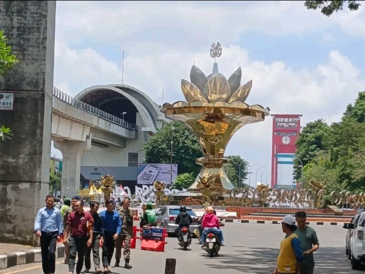 PALEMBANG, (CNK) – Pemandangan menarik tersaji di sepanjang Jalan Jenderal Sudirman, tepatnya dari kawasan Pasar Cinde menuju Masjid Agung Sultan Mahmud Badaruddin I. Dalam satu garis pandang, masyarakat dapat melihat tiga ikon pembangunan berbeda era, yakni Bundaran Air Mancur Tugu Cempako Telok, lintasan LRT Palembang, serta kemegahan Jembatan Ampera yang melintang di atas Sungai Musi.