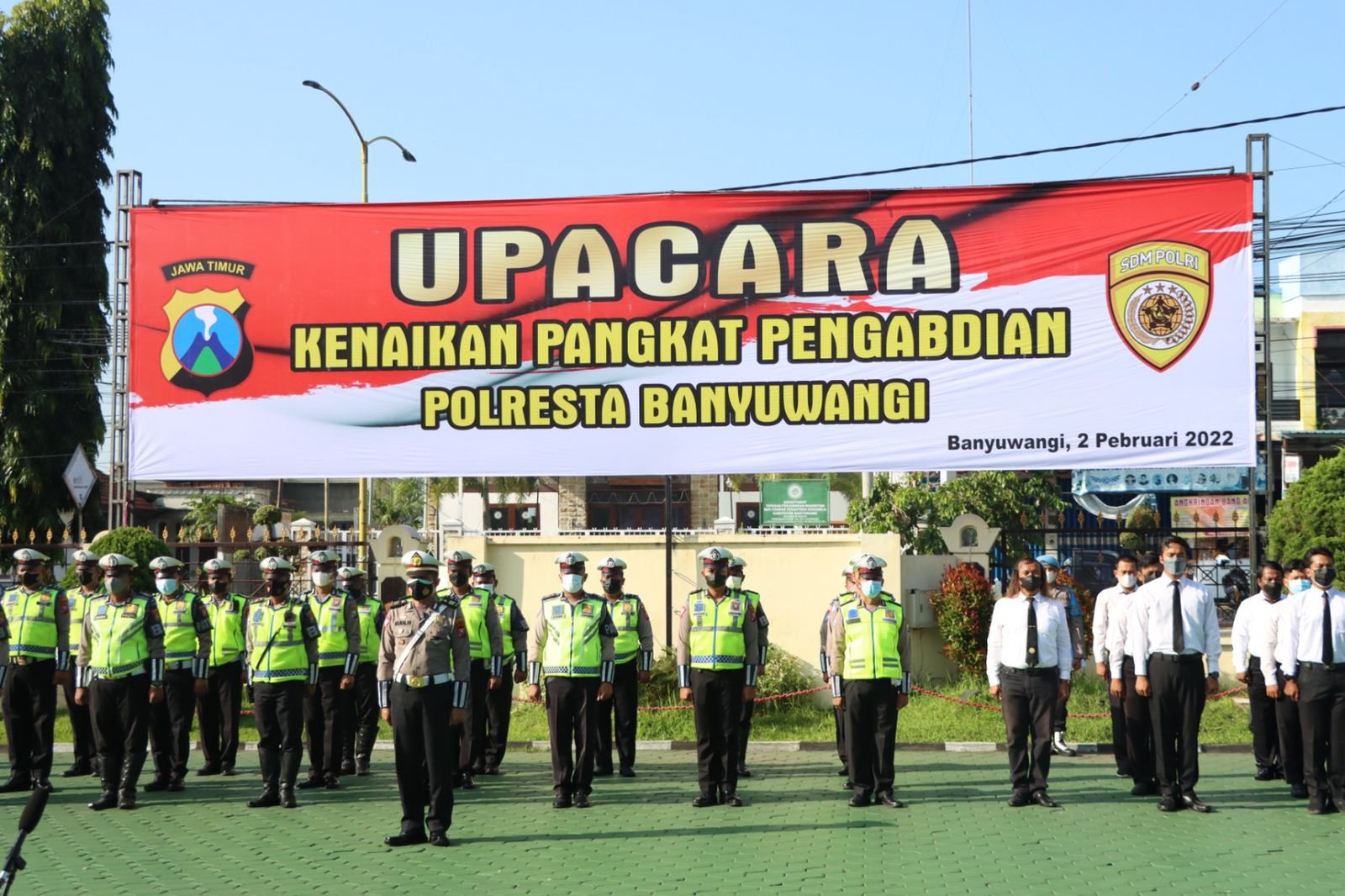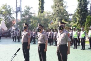 Banyuwangi – Kepala Kepolisian Resor Kota (Kapolresta) Banyuwangi Kombes Pol Nasrun Pasaribu memimpin upacara kenaikan pangkat pengabdian anggota di lapangan Mapolresta Banyuwangi, pada Rabu (02/02/2022).