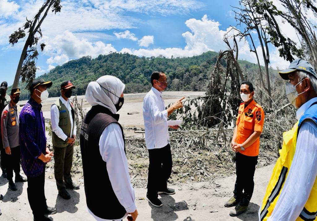 Lumajang – Presiden Joko Widodo meninjau langsung sejumlah lokasi terdampak erupsi Gunung Semeru di Kabupaten Lumajang, Provinsi Jawa Timur, pada Selasa, 7 Desember 2021. Kepala Negara hadir untuk memastikan penanganan bencana erupsi berjalan baik dan segenap kekuatan yang dimiliki oleh pemerintah telah siaga di lapangan.