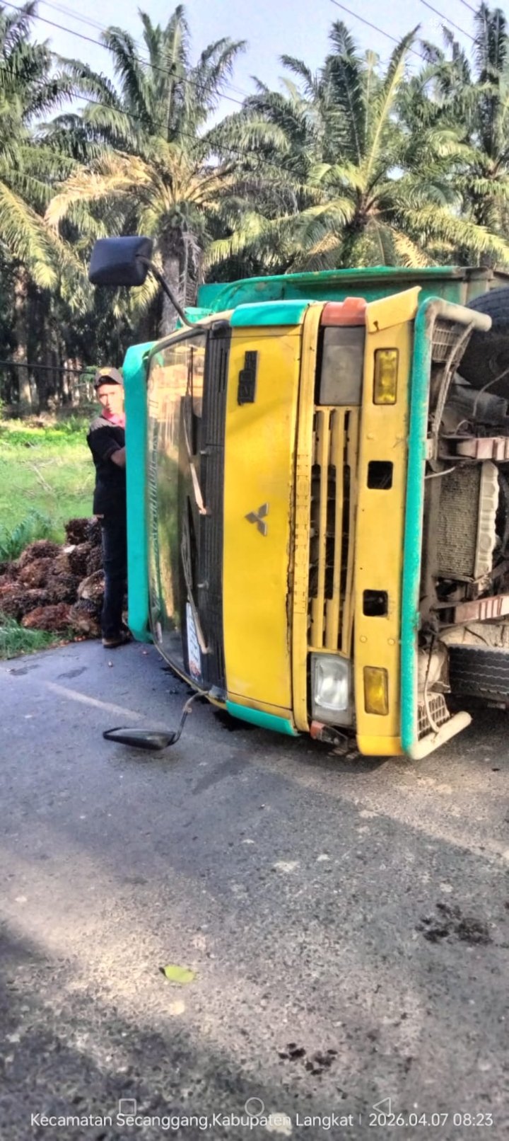 SECANGGANG, (CNK) – Sebuah truk pengangkut buah kelapa sawit milik (SP) mengalami kecelakaan tunggal hingga terbalik di ruas jalan lintas Secanggang menuju pabrik sawit Selasa (7/4) pukul 07.00 WIB. Peristiwa tersebut diduga terjadi akibat sopir kehilangan kendali saat melintasi jalan lurus .