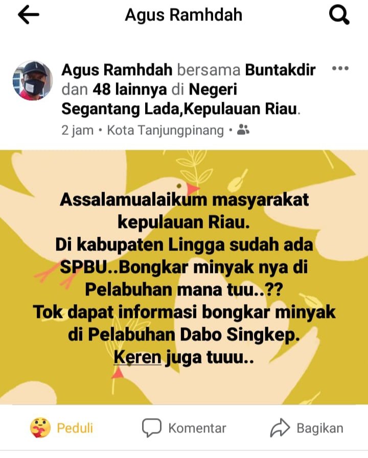 CAHAYANEWSKEPRI.COM – Didapati sebelumnya pada media sosial Aqun Facebook milik Ketua DPD LAMI Kepri Abdul Karim yang lebih dikenal dengan Agus Ramdah menuliskan “Assalamualaikum masyarakat Kepulauan Riau. Di Kabupaten lingga sudah ada SPBU .. Bongkar minyak di Pelabuhan mana tu.. ? Tok dapat informasi bongkar minyak di pelabuhan Dabo Singkep. Keren juga tu..”, tulisnya. Senin 29/11/2021 sekita pukul 09.00 Wib.