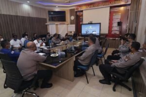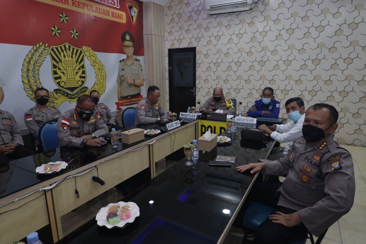 Batam – Dalam rangka komitmen membangun sinergitas bersama stakeholder, Wakapolda Kepri Brigjen Pol Drs. Darmawan, M.Hum., mengikuti Video Conference Perjanjian Kerja Sama Polri dan PSSI yang dipimpin Asops Kapolri Irjen Pol. Drs. Imam Sugianto, M.Si., dan Ketua Persatuan Sepak Bola Seluruh Indonesia (PSSI) Komjen. Pol. (Purn.) Dr. Drs. H. Mochamad Iriawan, S.H., M.M., M.H., di ruang Posko Biro Ops Polda Kepri. Dalam kesempatan tersebut hadir Wakapolda Kepri Brigjen Pol Drs. Darmawan, M.Hum., ASPROV PSSI Kepri, dan PJU Polda Kepri. Rabu, (17/11/2021).
