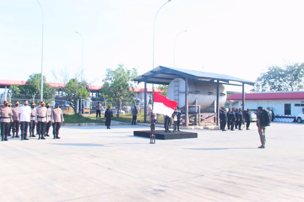 Batam – Wakapolda Kepri Brigjen Pol Rudi Pranoto,S.I.K., memimpin Upacara Pelepasan Kompi Penugasan Satbrimob Polda Kepri BKO Polda Sulawesi Tengah dalam rangka Ops Madago Raya 2022 di Bandara Hang Nadim Batam pada hari Minggu, (23/01/2022).