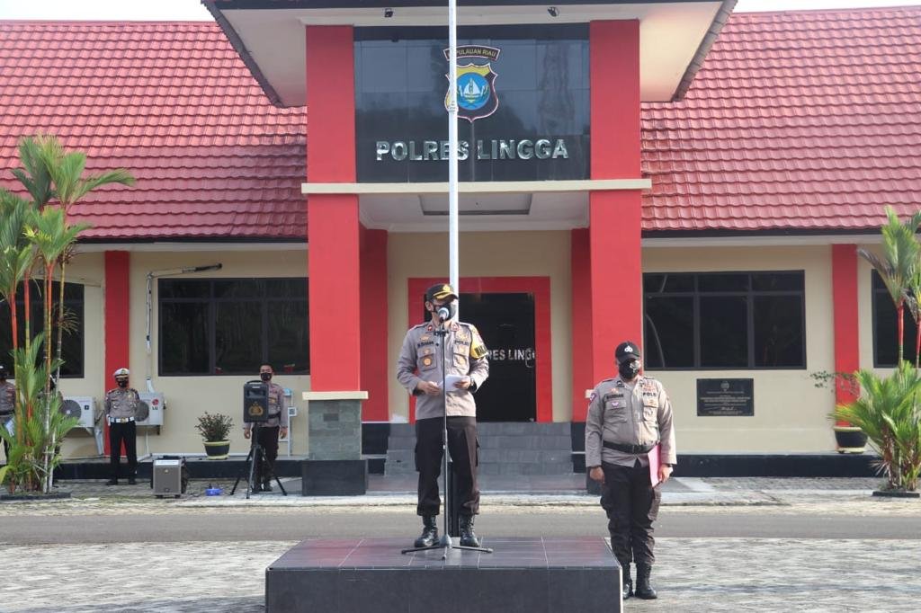 Lingga, Kepri – Wakapolres Lingga, Kompol M.Tahang S.Ag memimpin apel gelar pasukan operasi kepolisian kewilayahan Keselamatan Seligi 2021. Apel dilaksanakan di Lapangan Apel Mako Polres Lingga, Senin (12/4/2021).